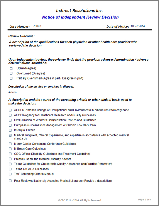 When you are ready to close a case and submit it to the state IRO department, you simply select the 'Complete Review Decision' report, select the case, select the recipients from a list of relevant recipients that pertain specifically to the case and submit it. When the report is finished running it will automatically be submitted to the state through email or fax where permitted by law. The report is in the proper format required by the state agency. Below is a sample of the report.